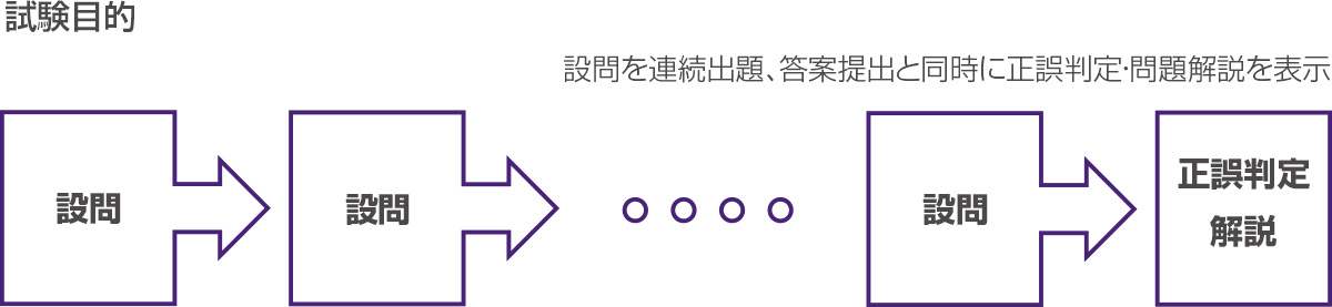 試験目的の場合は、設問を全て解答した上で、答案を提出。その場で合否判定を受講者に見せる/見せないの設定、合格通知メールを送信する/しないの設定、合格・修了証(PDF)を発行する/しないの設定、制限時間、設問カテゴリーごとの配点設定などを管理者画面で行うことができます。