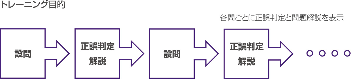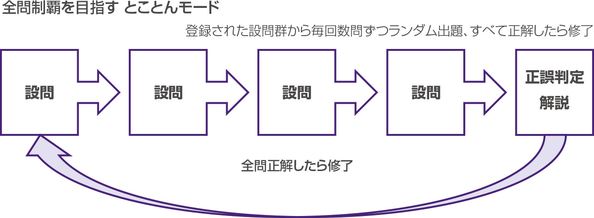 トレーニング目的の場合は、蓄積された設問群から毎回ランダムに数問ずつ出題し、1問解答することに、解説を表示させる設定ができます。「とことんモード」を選択すると、蓄積された設問群をすべて正解した時点で修了とする全問制覇型のトレーニングになります。